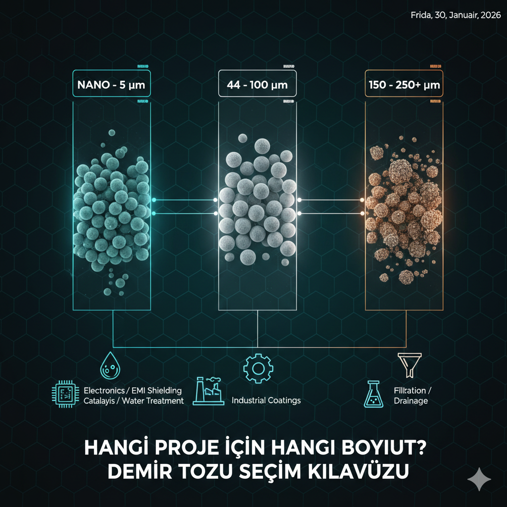 Demir tozu dünyasında “tek bir boyut her işe yarar” mantığı geçerli değildir. Yanlış parçacık boyutu seçimi, projenizin maliyetini artırabilir, ürünün dayanıklılığını düşürebilir veya kimyasal reaksiyonun başarısız olmasına neden olabilir. Bu kılavuzda, projelerinizde doğru demir tozunu seçmeniz için gerekli tüm teknik detayları ele alıyoruz. 1. Parçacık Boyutu Neden Bu Kadar Önemli? Demir tozunun fiziksel boyutu (mikron […]
