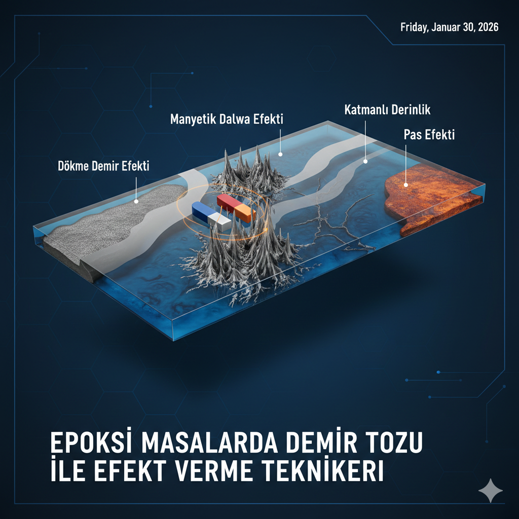 Epoksi reçine projelerinde estetiği belirleyen en önemli unsur, kullanılan pigmentler ve dolgu malzemeleridir. Klasik sedefli boyaların ötesine geçmek isteyen ustalar için demir tozu, gerçekçi metalik dokular ve manyetik efektler yaratmanın anahtarıdır. İşte epoksi masalarınızda demir tozu kullanarak fark yaratmanızı sağlayacak profesyonel teknikler. 1. Homojen Metalik Görünüm: “Dökme Demir” Efekti Masaya masif bir metal bloğu görünümü […]