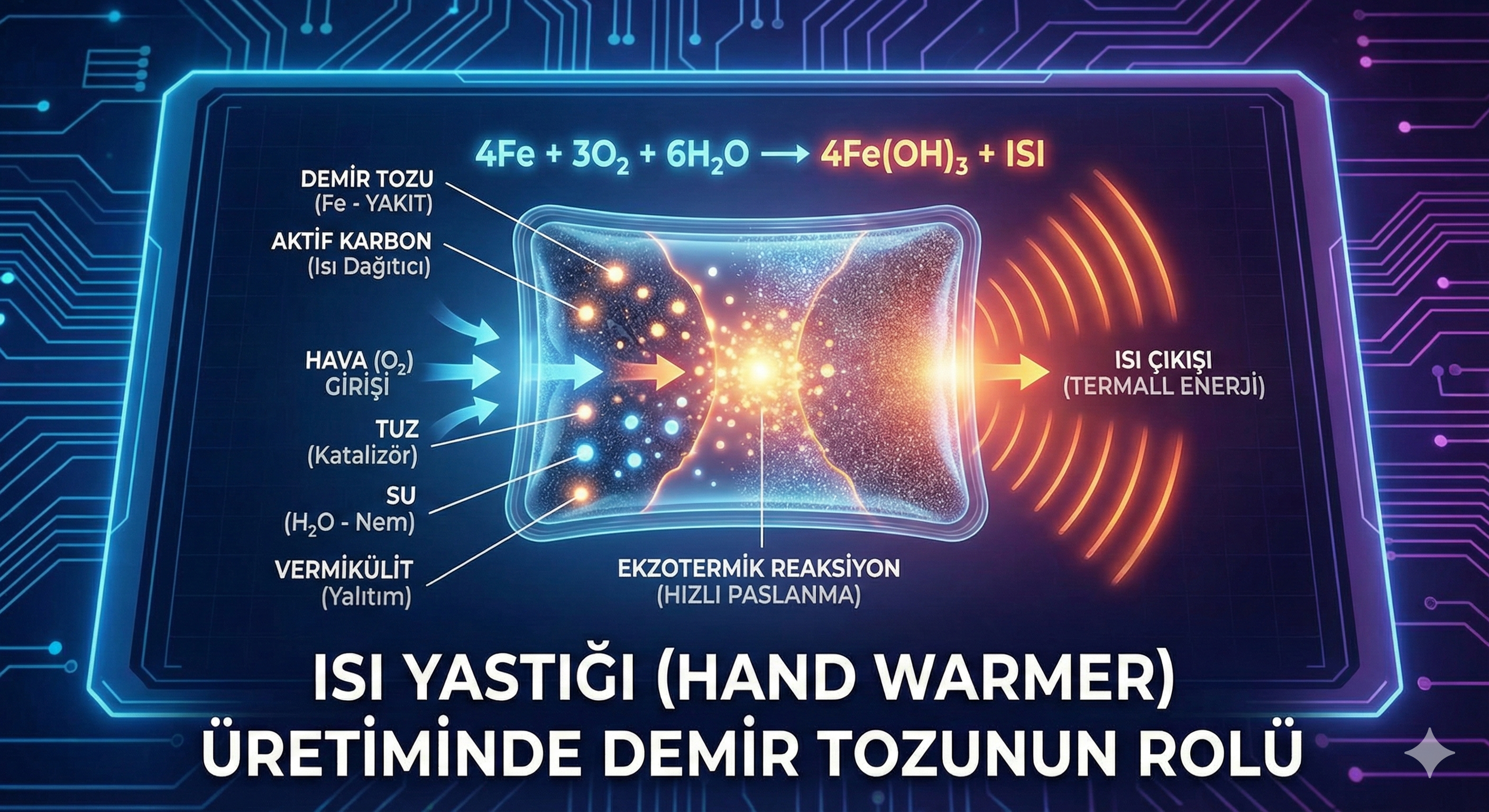 Kışın soğuk günlerinde montunuzun cebine attığınız, ambalajını açar açmaz ısınmaya başlayan o küçük paketleri bilirsiniz. Peki, ne pil ne de elektrik bağlantısı olmadan bu ısı yastıkları (hand warmers) saatlerce nasıl sıcak kalabiliyor? Bu “sihrin” arkasında aslında çok temel bir kimya prensibi ve başrol oyuncusu olarak demir tozu yatıyor. Bu yazımızda, ısı yastıklarının çalışma prensibini, demir […]