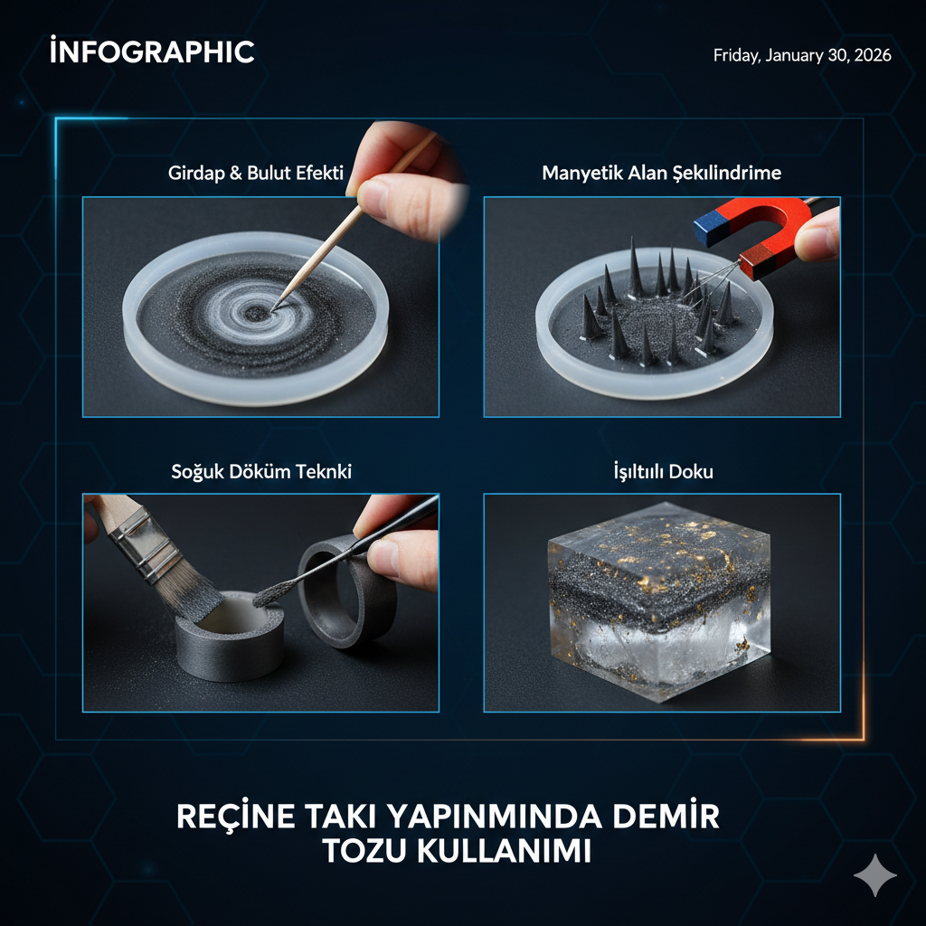 Reçine takı tasarımı, sonsuz yaratıcılık sunan bir alan olsa da, bazen tasarımlar çok “hafif” veya “plastikimsi” görünebilir. İşte bu noktada demir tozu, reçine kolyelere, küpelere ve yüzüklere gerçek bir metalik ağırlık, derinlik ve benzersiz manyetik özellikler kazandırmak için devreye giriyor. 1. Takı Tasarımında Demir Tozu Neden Kullanılır? Demir tozunun reçine içinde kullanımı, geleneksel boyalardan çok […]
